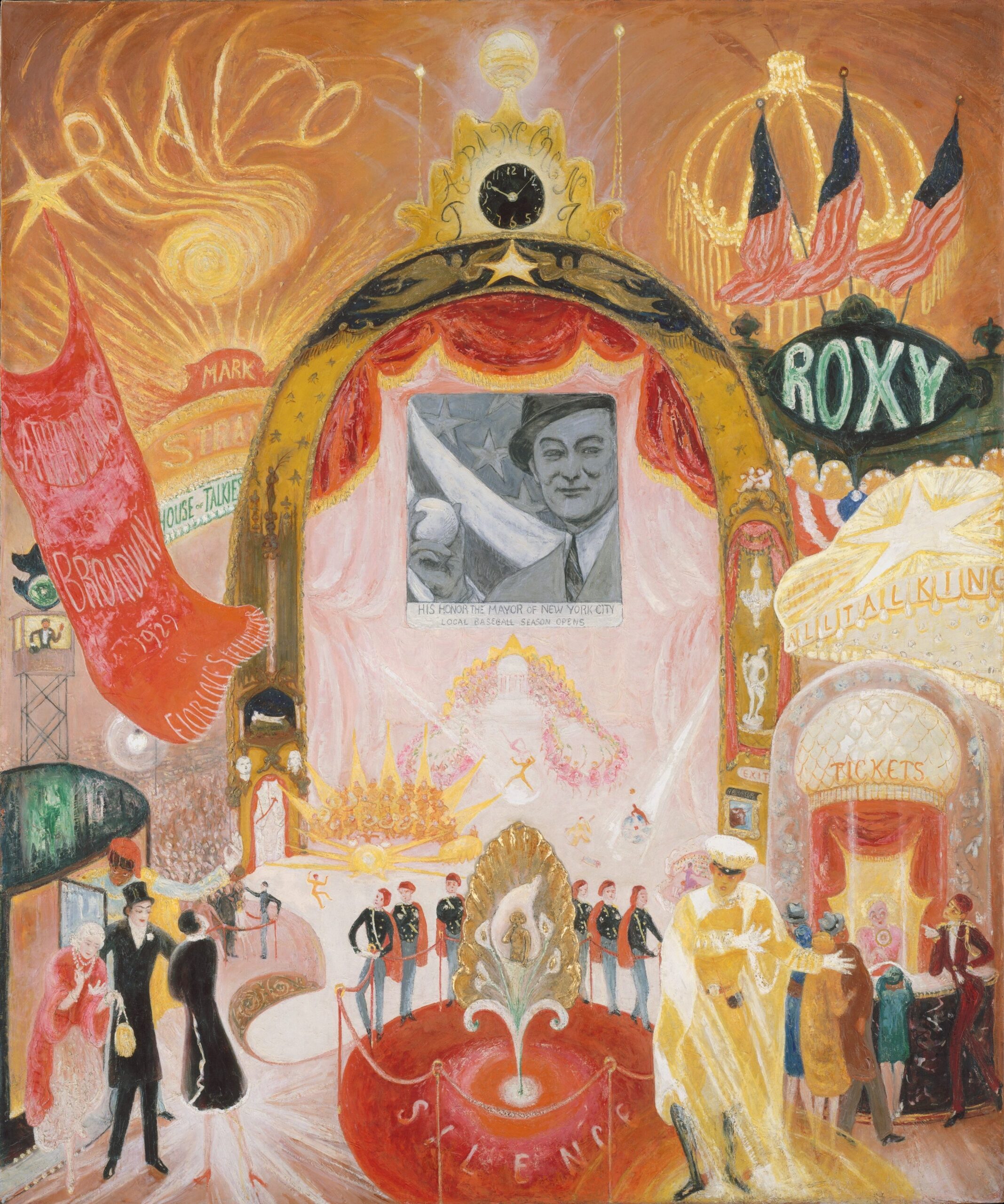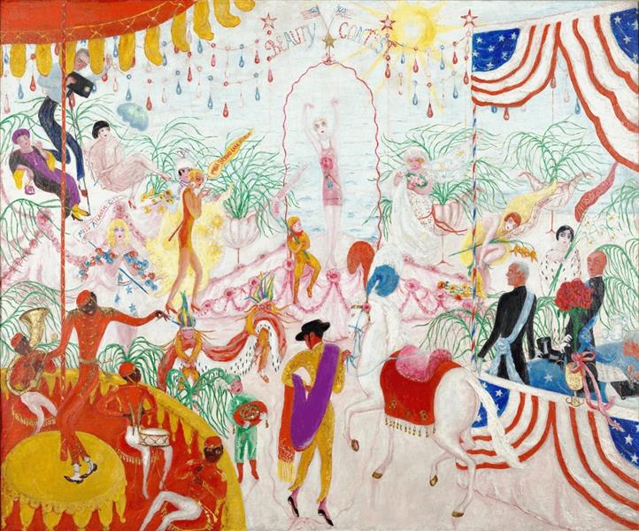 Ihre komischen Darstellungen von Billboards, Broadway Shows, Einkaufszentren, Zeitschriftenwerbungen verliehen Stettheimer bisweilen den Ruf einer Pop Art Vorreiterin. Stettheimer teilt mit späteren US-Underground-Strömungen einerseits, dass sie amerikanische Kommerz- und Alltagskultur als ästhetische Erlebnisse verhandelt, andererseits den schelmischen Camp-Humor, mit dem sie dies umsetzt. Einige Werke rücken sie so in die Nähe zu Susan Sontags Beschreibung von Camp als “dandyism in the age of mass culture” (Notes On „Camp“, 1964). Stettheimers Gemälde Beauty Contest To the Memory of P.T. Barnum von 1923 zeigt einen Schönheitswettbewerb mit Zirkuselementen inmitten fast explosionsartig aus Vasen herausschießender Pflanzengirlanden, die das spektakelhafte noch verstärken. Das Bild Spring Sale at Bendel’s von 1921 ist wiederum wohl das einzige historische Avantgarde Werk, das sichtbar vergnügt ein so “vulgäres” Motiv wie den Frühjahrsabverkauf im Department Store wählt. Ein roter Vorhang öffnet sich dabei bühnenhaft zur Seite und gibt Sicht auf die Szene frei, wo Shopperinnen und Textilien sich tänzelnd durch den Raum bewegen, um theatralisch hindrapiert zu landen.